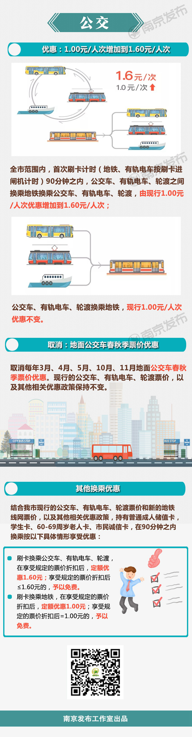 南京自2014年8月1日起,實施公共交通換乘優(yōu)惠政策,刷卡乘坐公交車、有軌電車、輪渡、地鐵,90分鐘之內(nèi),換乘優(yōu)惠0.40元/人次;2017年8月1日起,90分鐘之內(nèi),換乘優(yōu)惠由0.40元/人次增加到1.00元/人次。