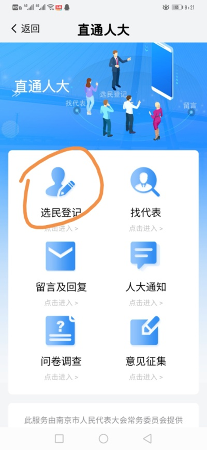 一、打開“我的南京”APP,找到積極參加換屆選舉,點進入。