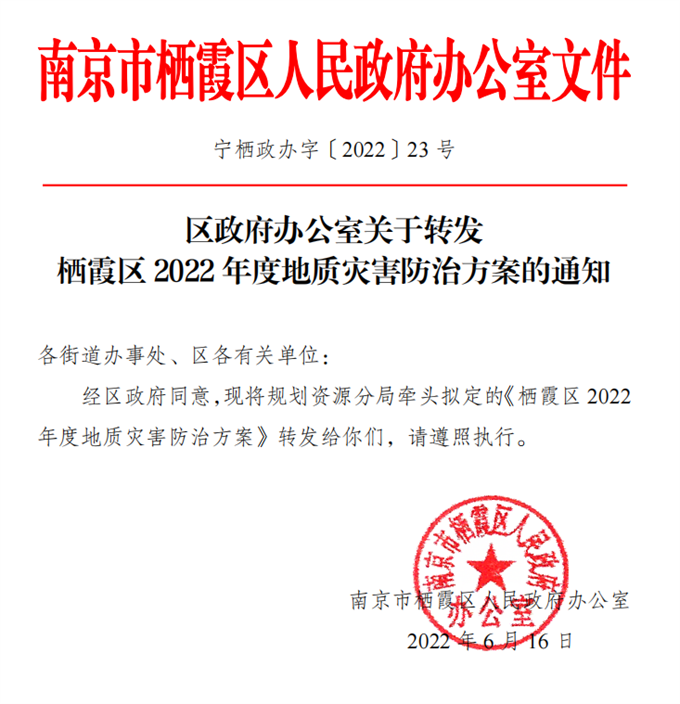 寧棲政辦字〔2022〕23號 區政府辦公室關于轉發棲霞區2022年度地質災害防治工作方案的通知