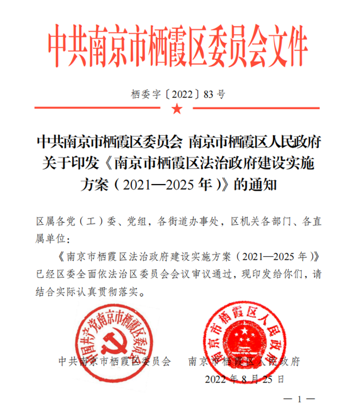 棲委字〔2022〕83號中共南京市棲霞區委員會南京市棲霞區人民政府關于印發《南京市棲霞區法治政府建設實施方案(2021—2025年)》的通知 (1).pdf