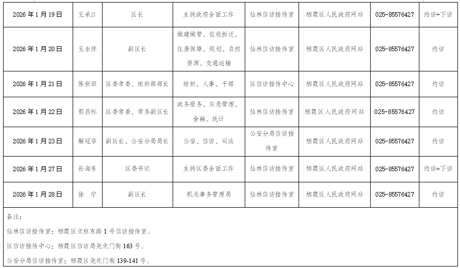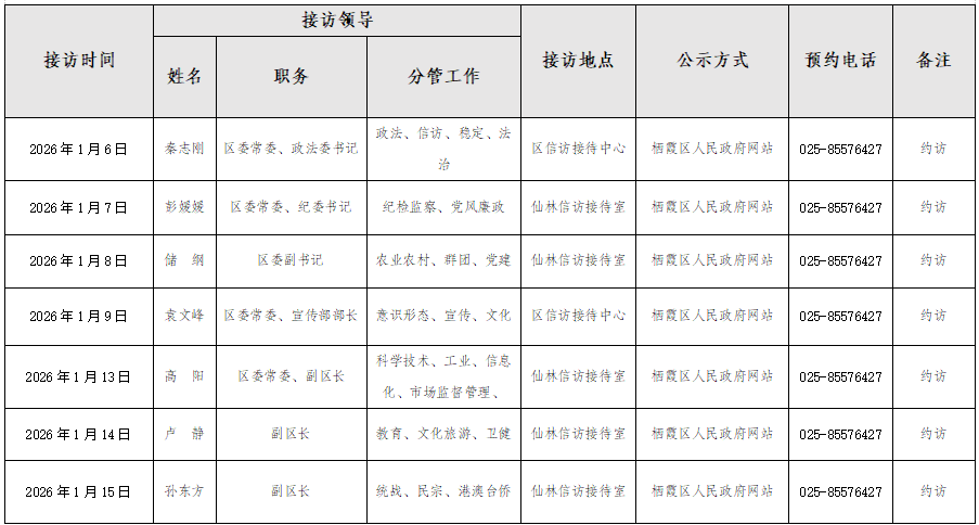 棲霞區2026年1月黨政領導干部接訪日程安排表