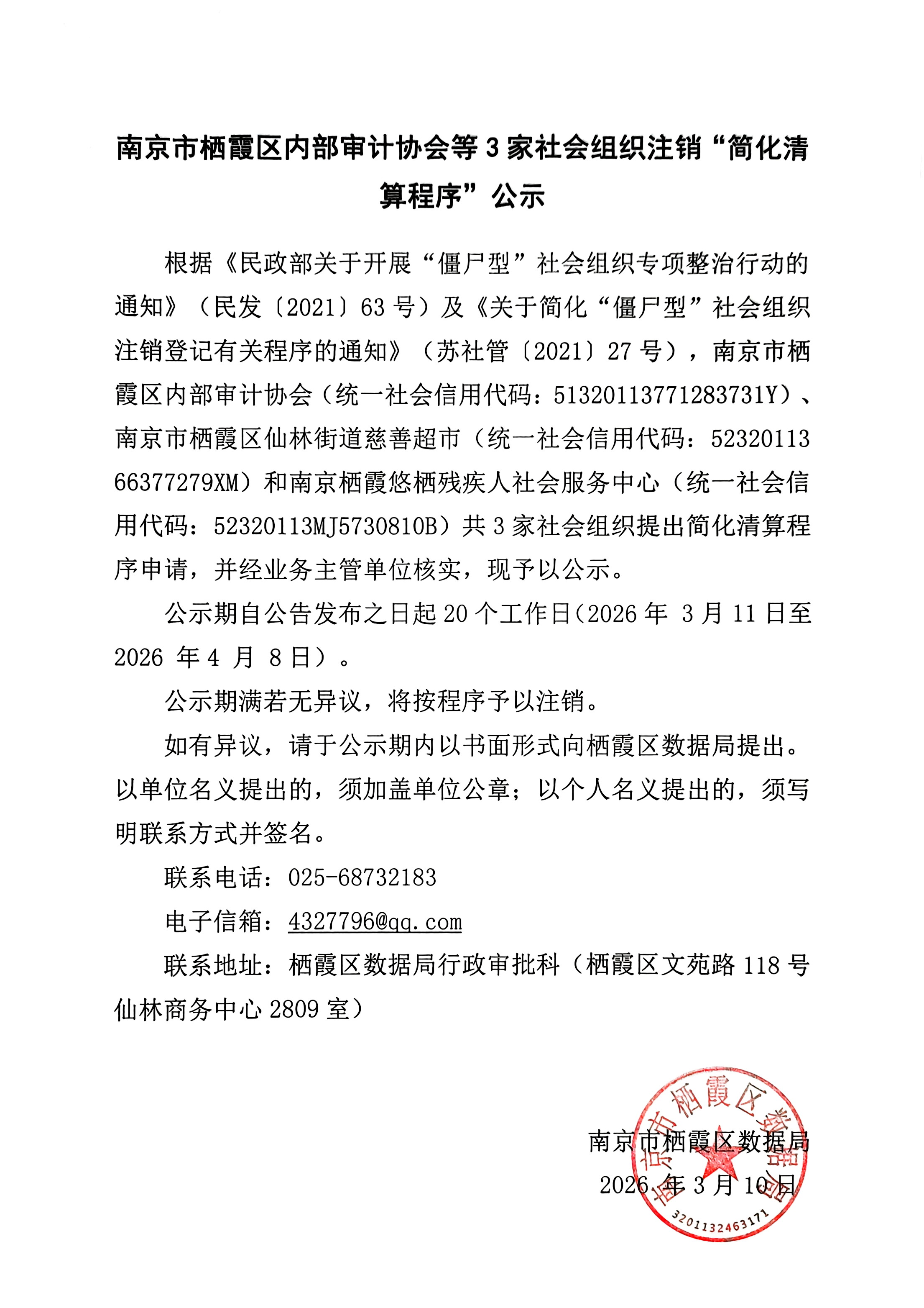 南京市棲霞區內部審計協會等3家社會組織注銷“簡化清算程序”公示
