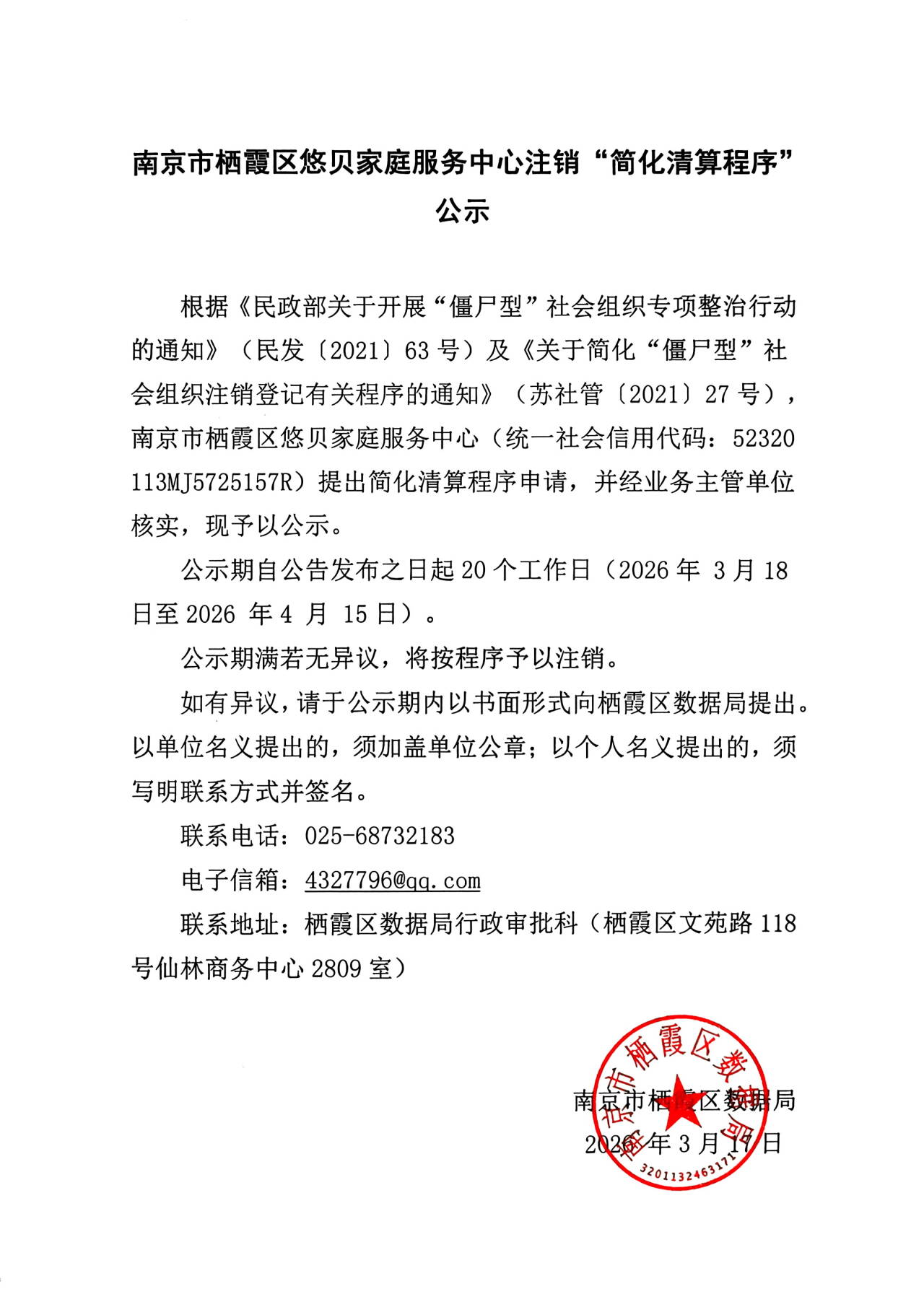 南京市棲霞區(qū)悠貝家庭服務(wù)中心注銷“簡(jiǎn)化清算程序”公示