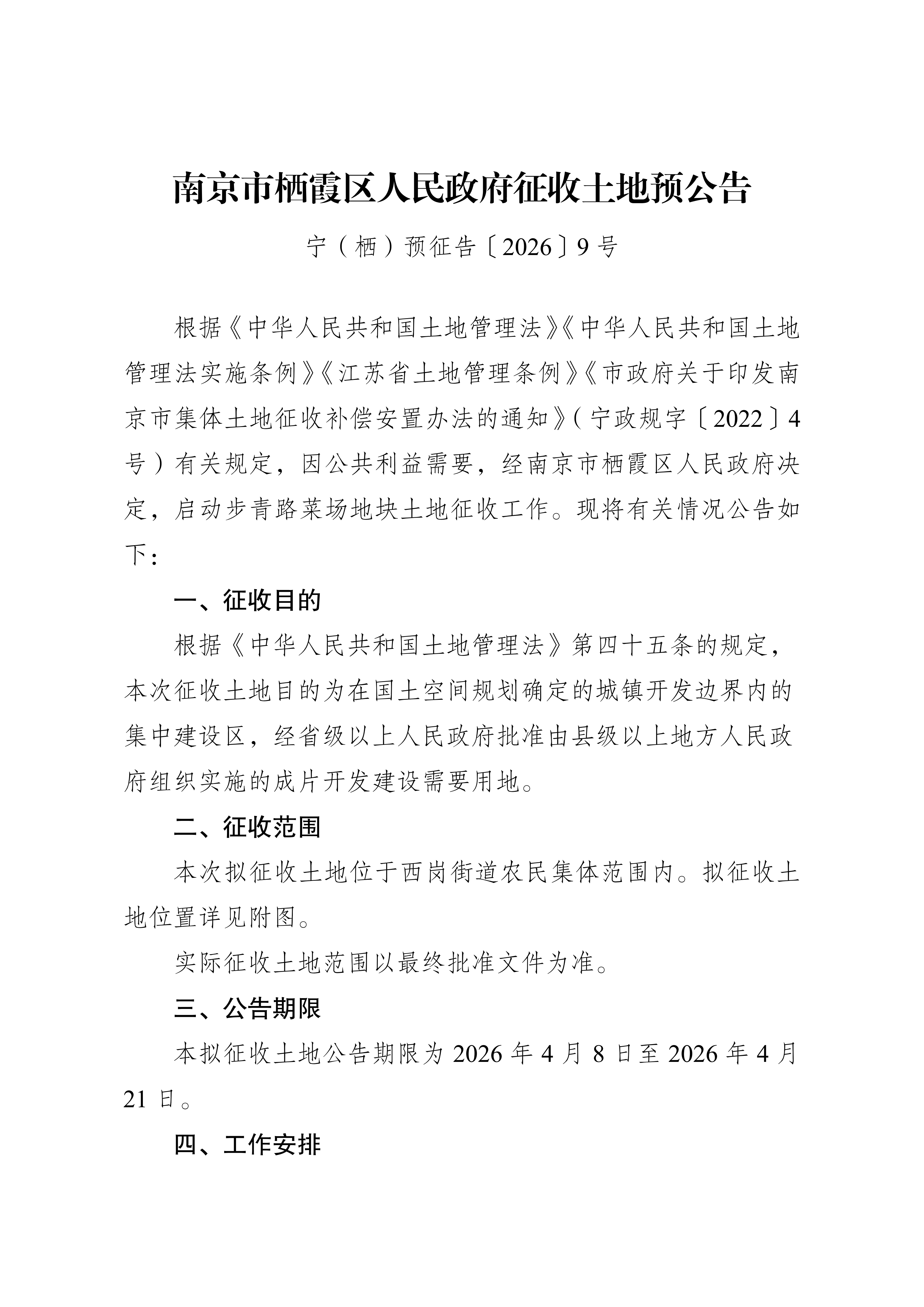 信息名稱:    寧(棲)預征告〔2026〕9號-步青路菜場地塊