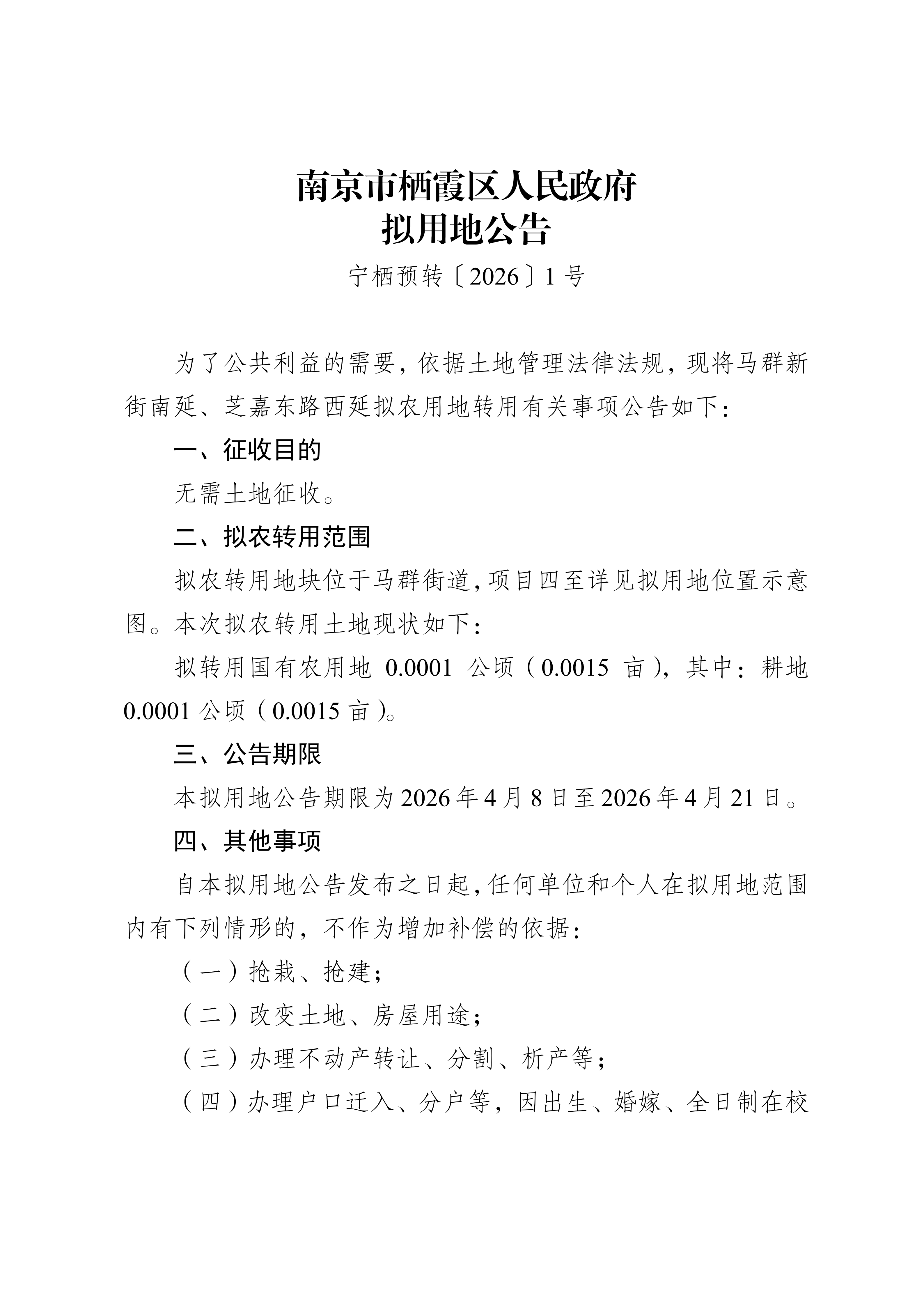 信息名稱:    寧棲預轉〔2026〕1號-馬群新街南延、芝嘉東路西延