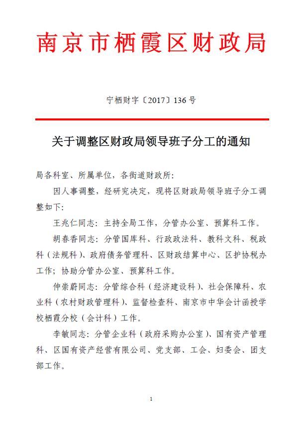 關(guān)于調(diào)整區(qū)財(cái)政局領(lǐng)導(dǎo)班子分工的通知