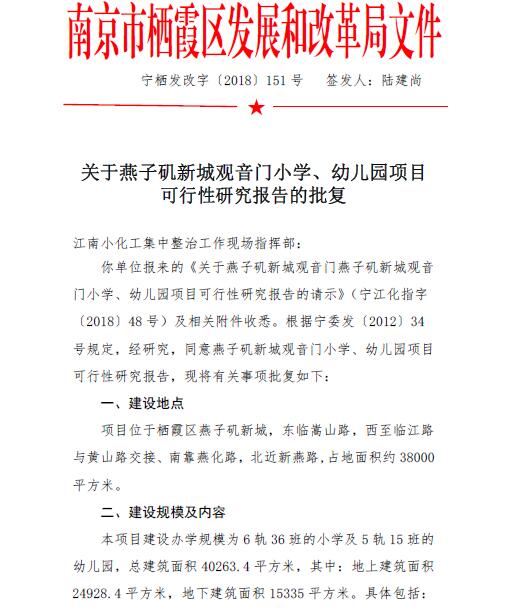 寧棲發改字〔2018〕151號 關于燕子磯新城觀音門小學、幼兒園項目可行性研究報告的批復.pdf