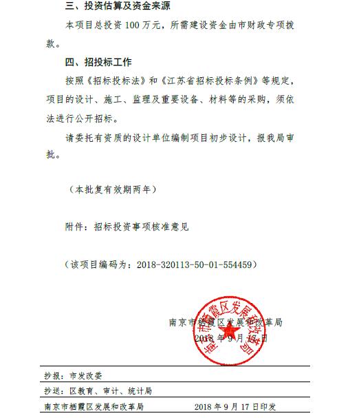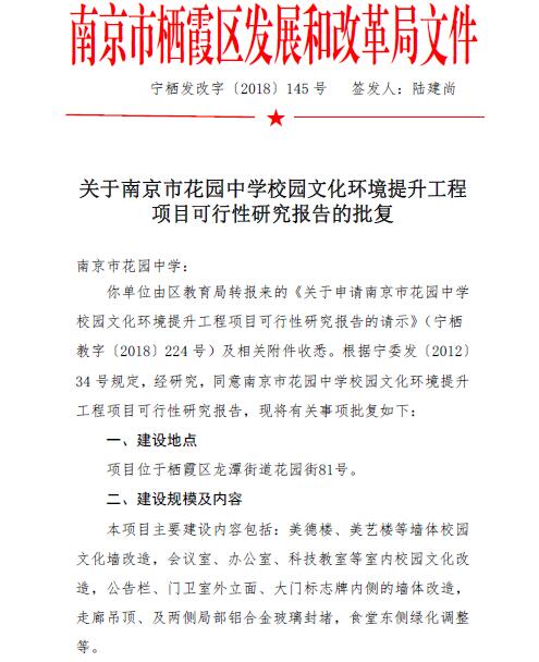 內(nèi)容概覽:    寧棲發(fā)改字〔2018〕145號(hào) 關(guān)于南京市花園中學(xué)校園文化環(huán)境提升工程項(xiàng)目可行性研究報(bào)告的批復(fù)