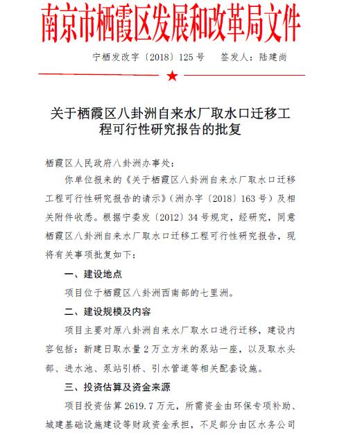 寧棲發改字〔2018〕125號 關于棲霞區八卦洲自來水廠取水口遷移工程可行性研究報告的批復.pdf