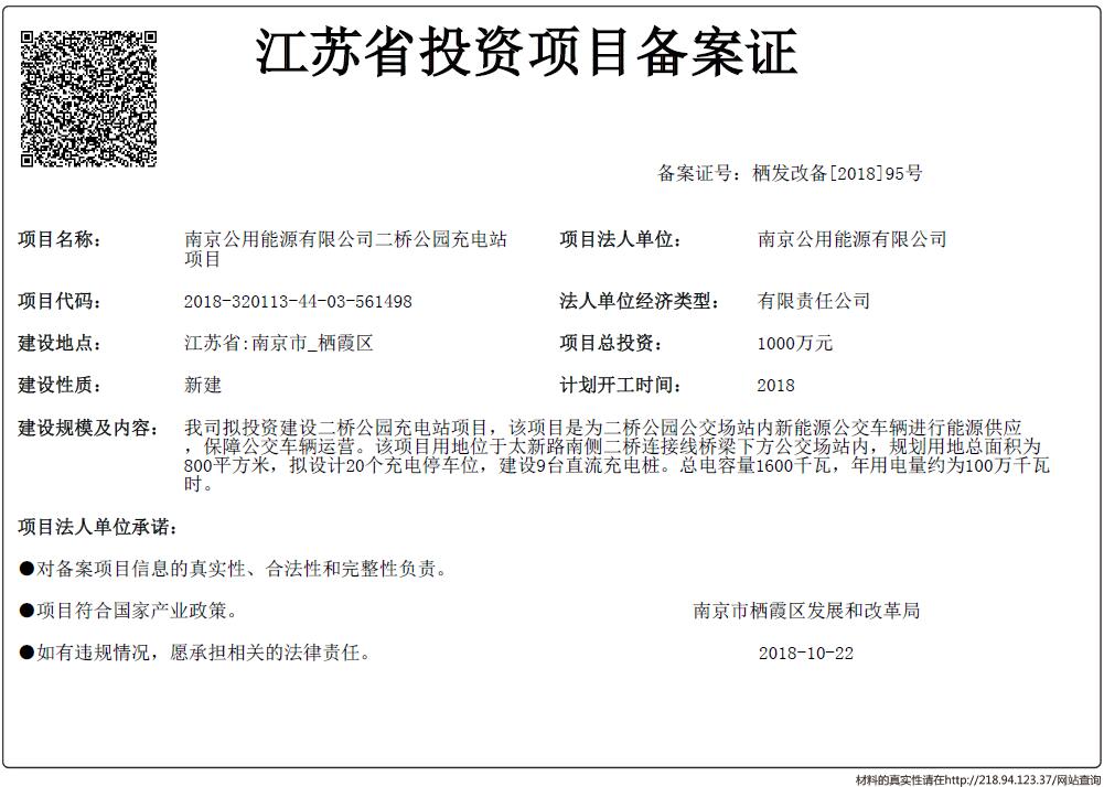 信息名稱:    江蘇省投資項(xiàng)目備案證-南京公用能源有限公司二橋公園充電站項(xiàng)目