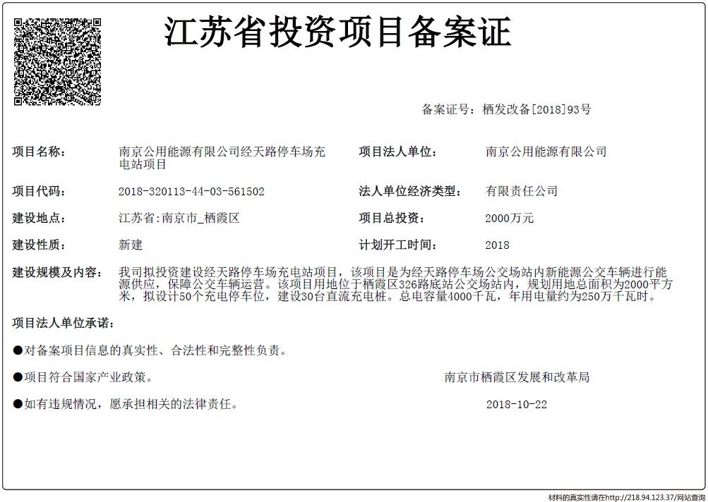 信息名稱:    江蘇省投資項目備案證-南京公用能源有限公司經天路停車場充電站項目
