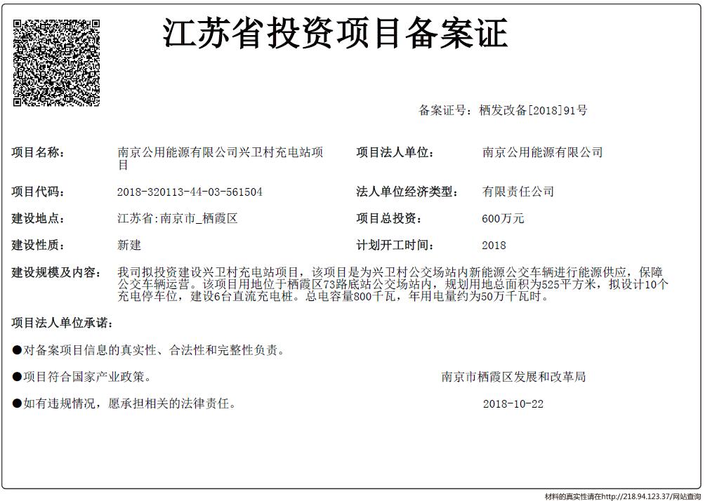 信息名稱:    江蘇省投資項目備案證-南京公用能源有限公司興衛村充電站項目
