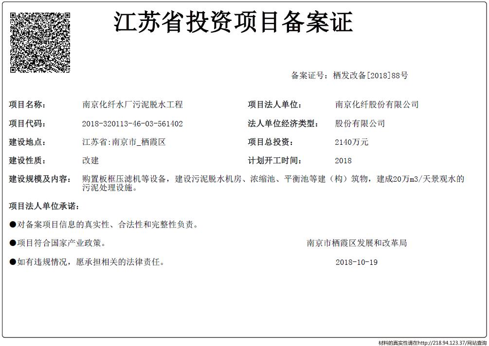 信息名稱:    江蘇省投資項目備案證-南京化纖水廠污泥脫水工程