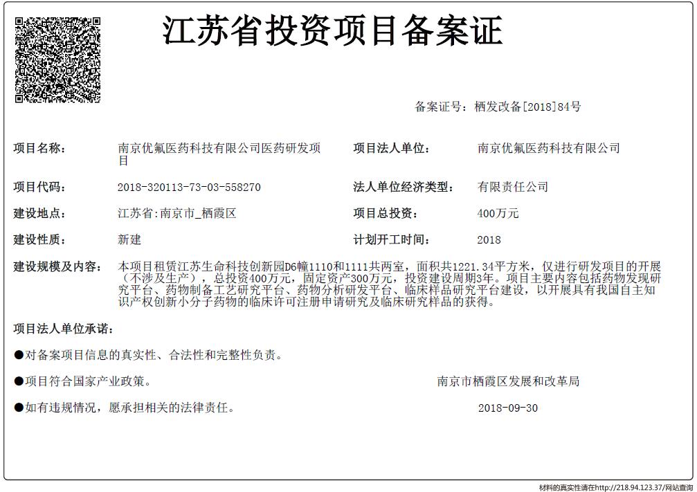 棲發(fā)改備[2018]84號 南京優(yōu)氟醫(yī)藥科技有限公司醫(yī)藥研發(fā)項目.pdf