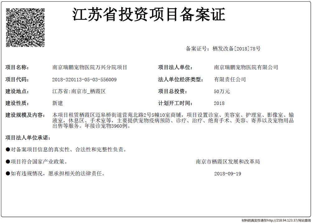 信息名稱:    江蘇省投資項目備案證-南京瑞鵬寵物醫院萬興分院項目
