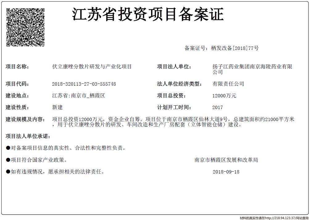 信息名稱:    江蘇省投資項目備案證-伏立康唑分散片研發與產業化項目