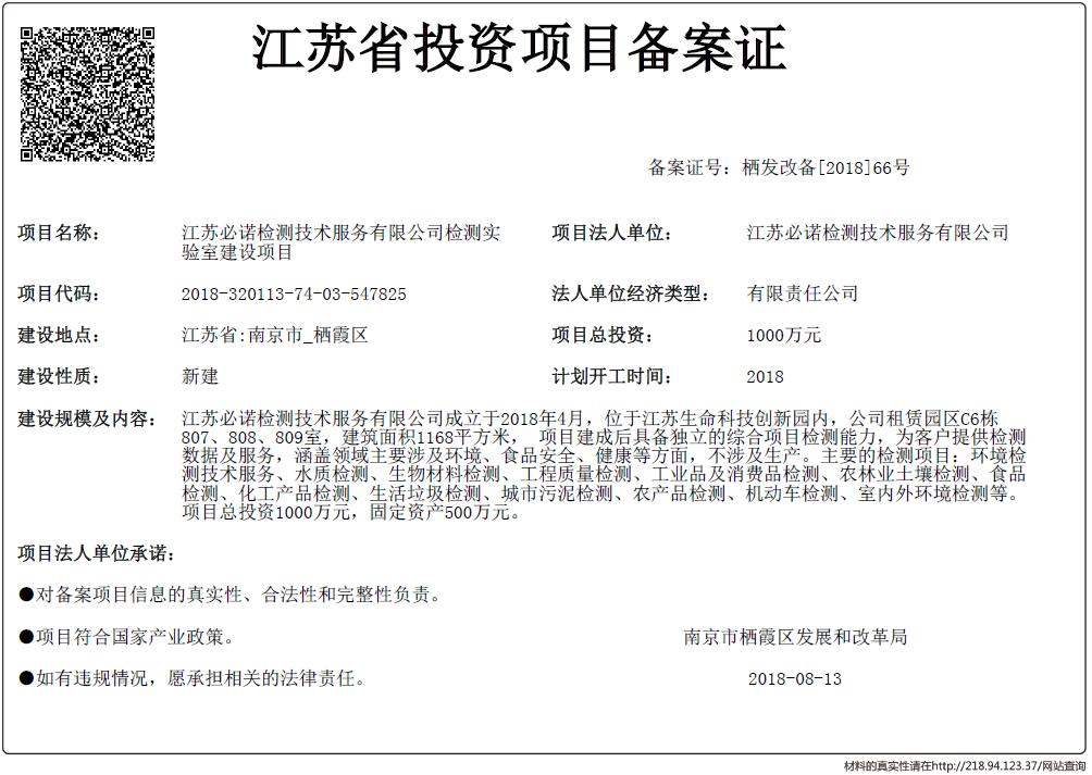 信息名稱:    江蘇省投資項目備案證-江蘇必諾檢測技術服務有限公司檢測實驗室建設項目