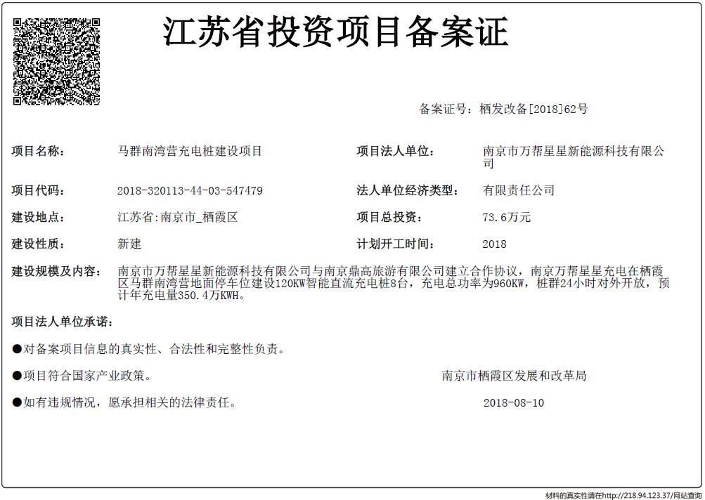 信息名稱:    江蘇省投資項目備案證-馬群南灣營充電樁建設項目