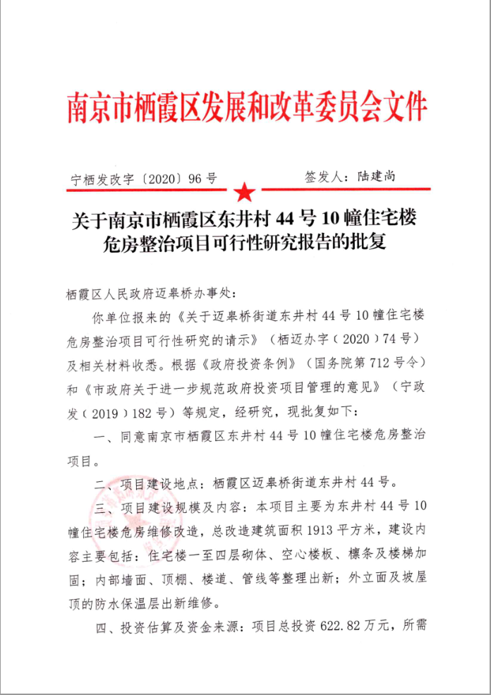 關于南京市棲霞區東井村44號10幢住宅樓危房整治項目可行性研究報告的批復