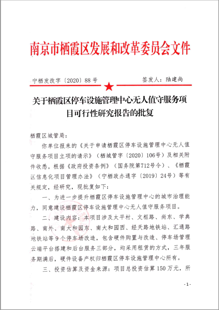 關于棲霞區停車設施管理中心無人值守服務項目可行性研究報告的批復