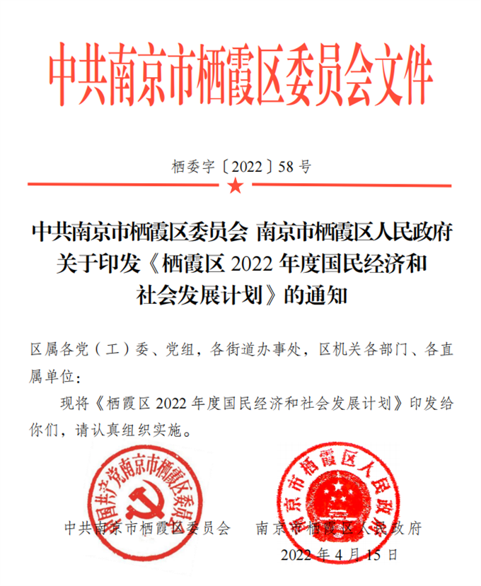 中共南京市棲霞區委員會南京市棲霞區人民政府關于印發《棲霞區2022年度國民經濟和社會發展計劃》的通知
