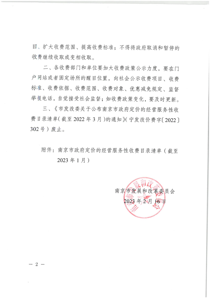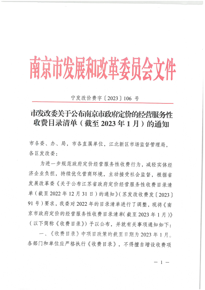 市發改委關于公布南京市政府定價的經營服務性收費目錄清單(截至2023年1月)的通知