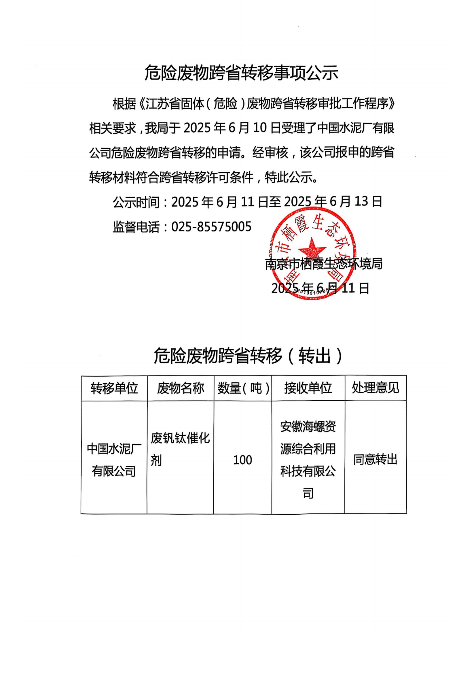 信息名稱:    危險廢物跨省轉(zhuǎn)移事項公示