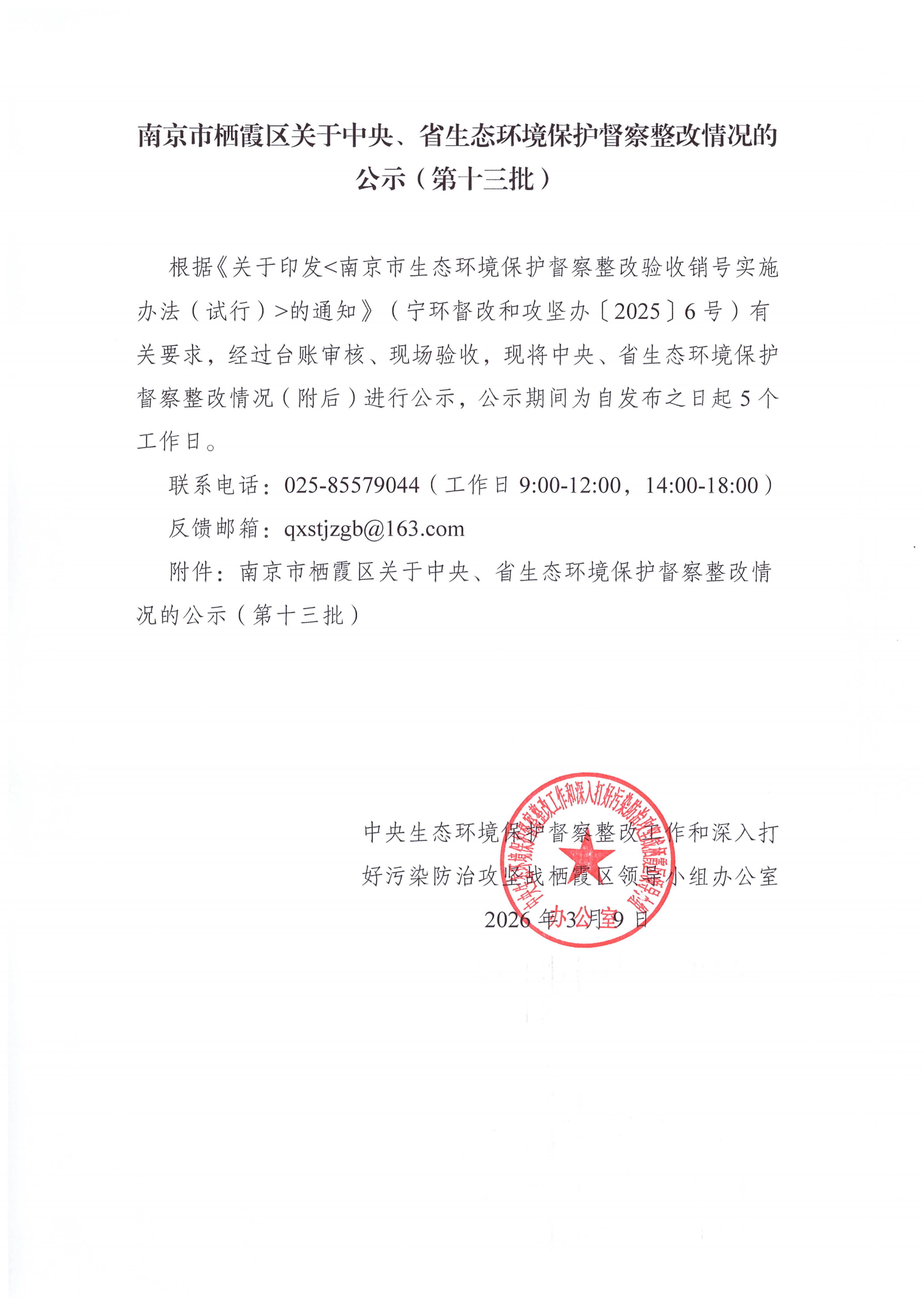 南京市棲霞區(qū)關(guān)于中央、省生態(tài)環(huán)境保護督察整改情況的公示(第十三批)