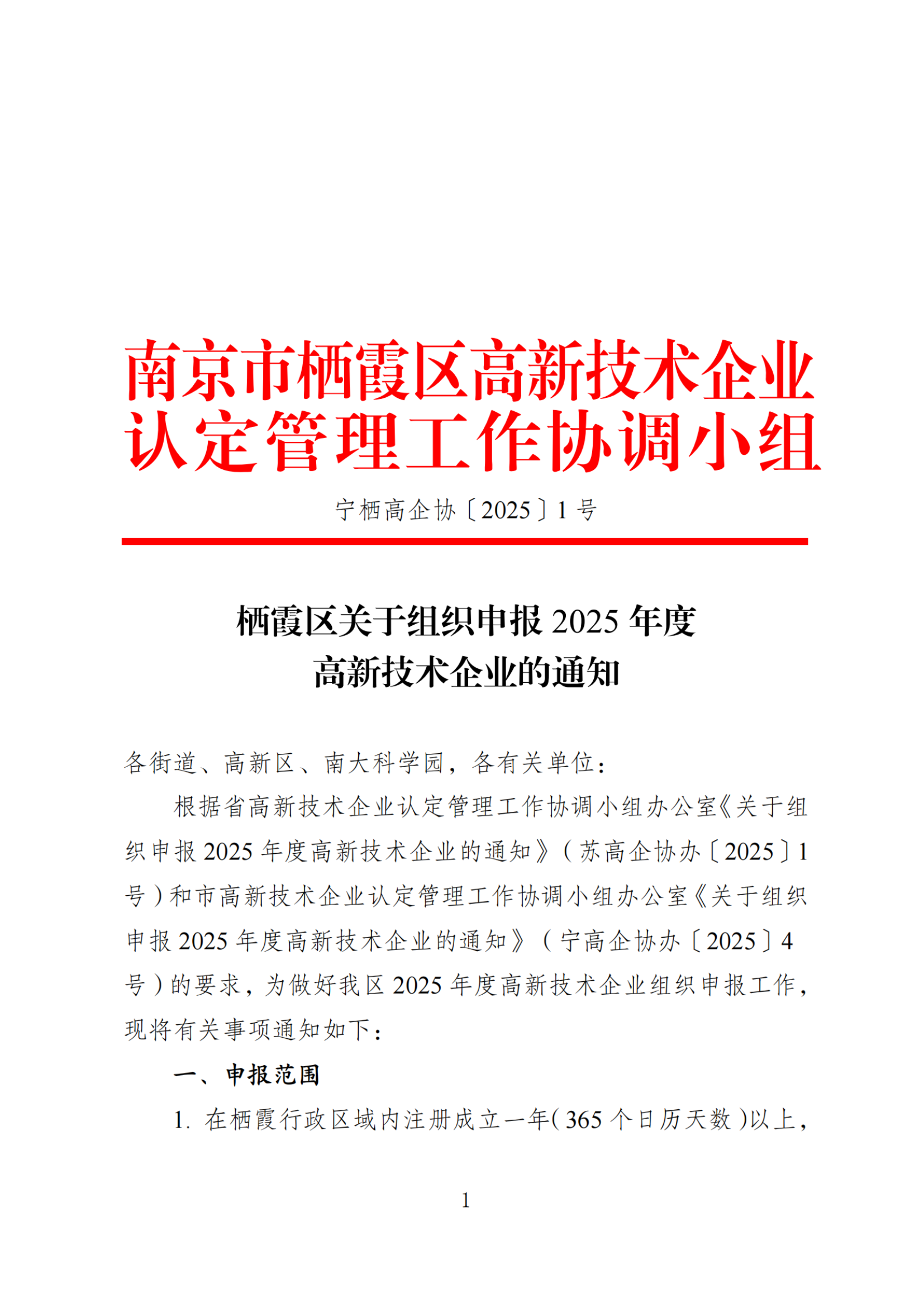 寧棲高企協(xié)〔2025〕1號(hào) 棲霞區(qū)關(guān)于組織申報(bào)2025年高新技術(shù)企業(yè)的通知