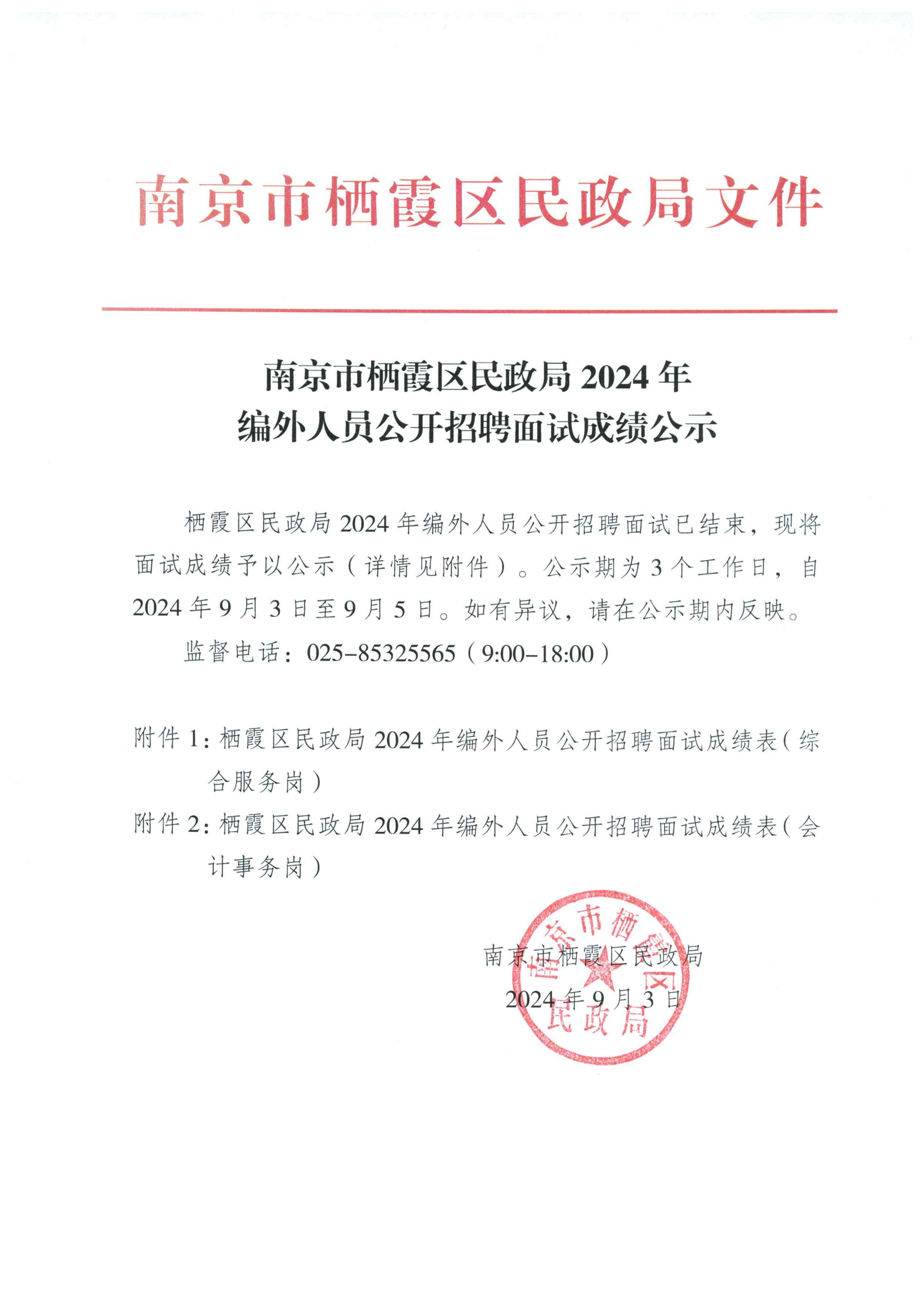 南京市棲霞區民政局2024年編外人員公開招聘面試成績公示