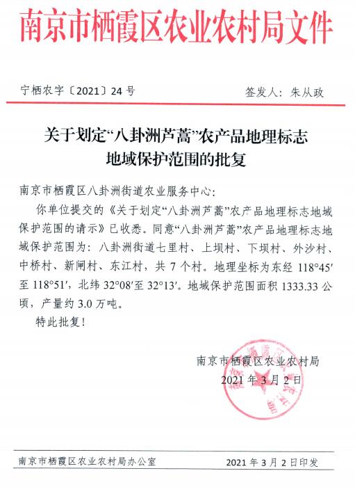 關(guān)于劃定“八卦洲蘆蒿”農(nóng)產(chǎn)品地理標(biāo)志地域保護(hù)范圍的批復(fù)(寧棲農(nóng)字〔2021〕24號).pdf