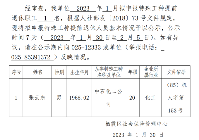 南京市特殊工種提前退休人員情況公示