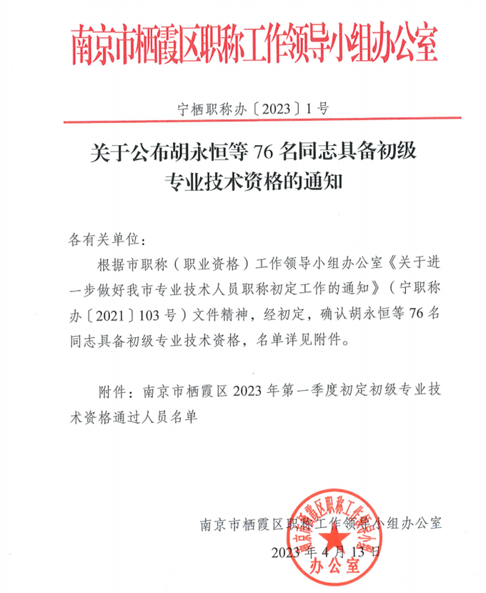 關(guān)于公布胡永恒等76名同志具備初級專業(yè)技術(shù)資格的通知