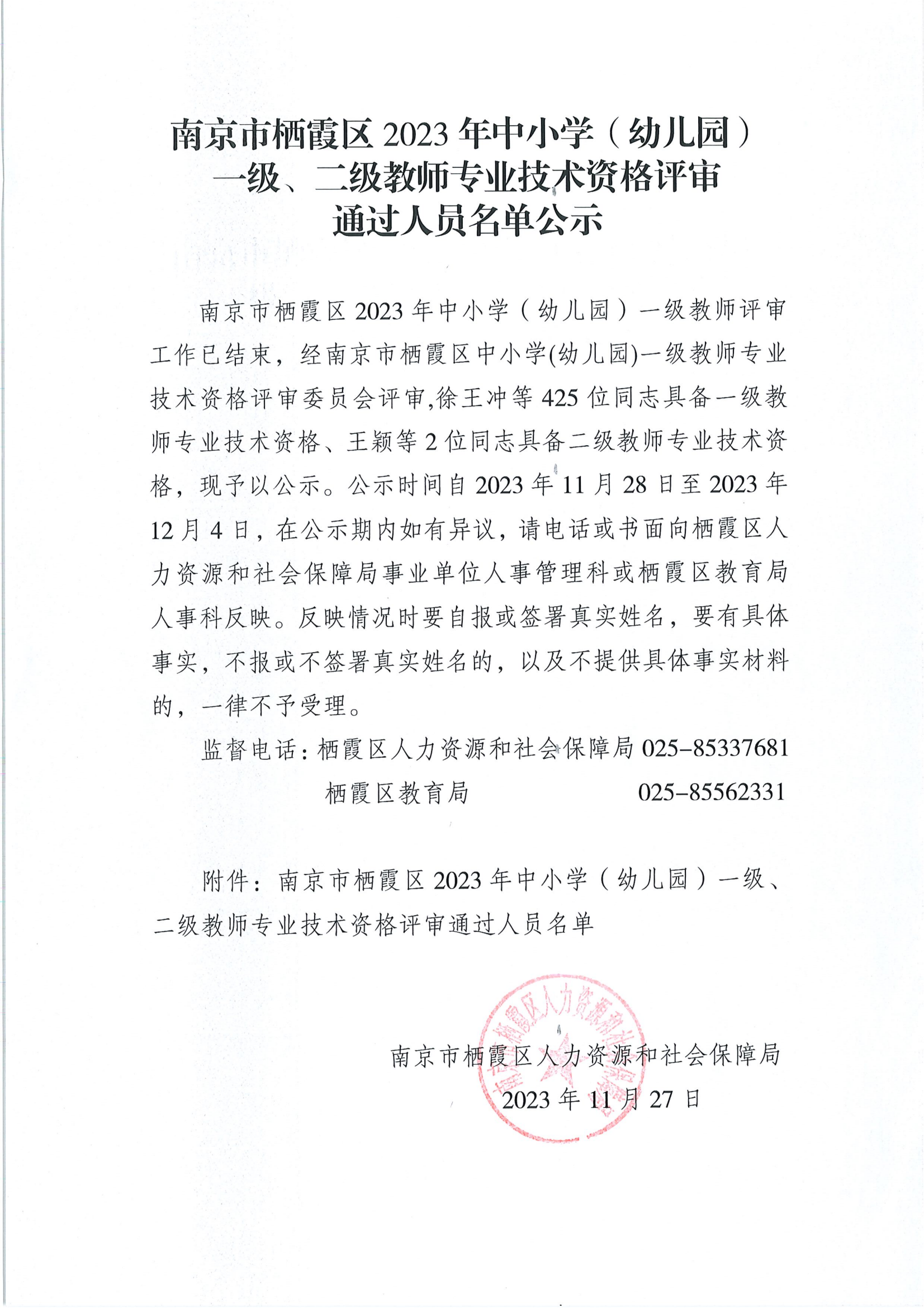 南京市棲霞區(qū)2023年中小學(xué)(幼兒園)一級、二級教師評審?fù)ㄟ^人員名單公示