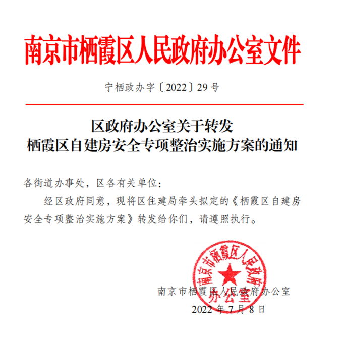 寧棲政辦字〔2022〕29號 區政府辦公室關于轉發棲霞區自建房安全專項整治實施方案的通知