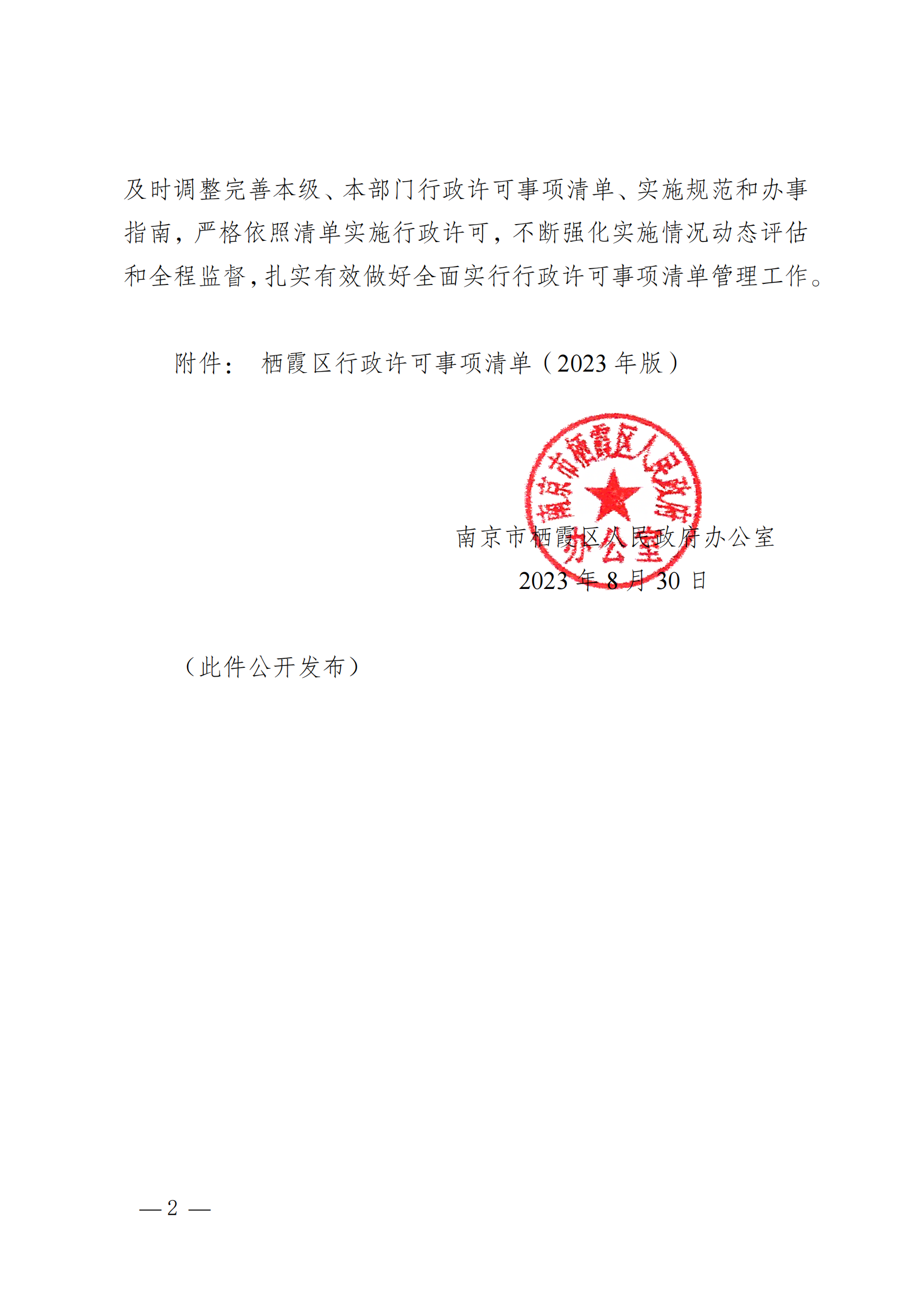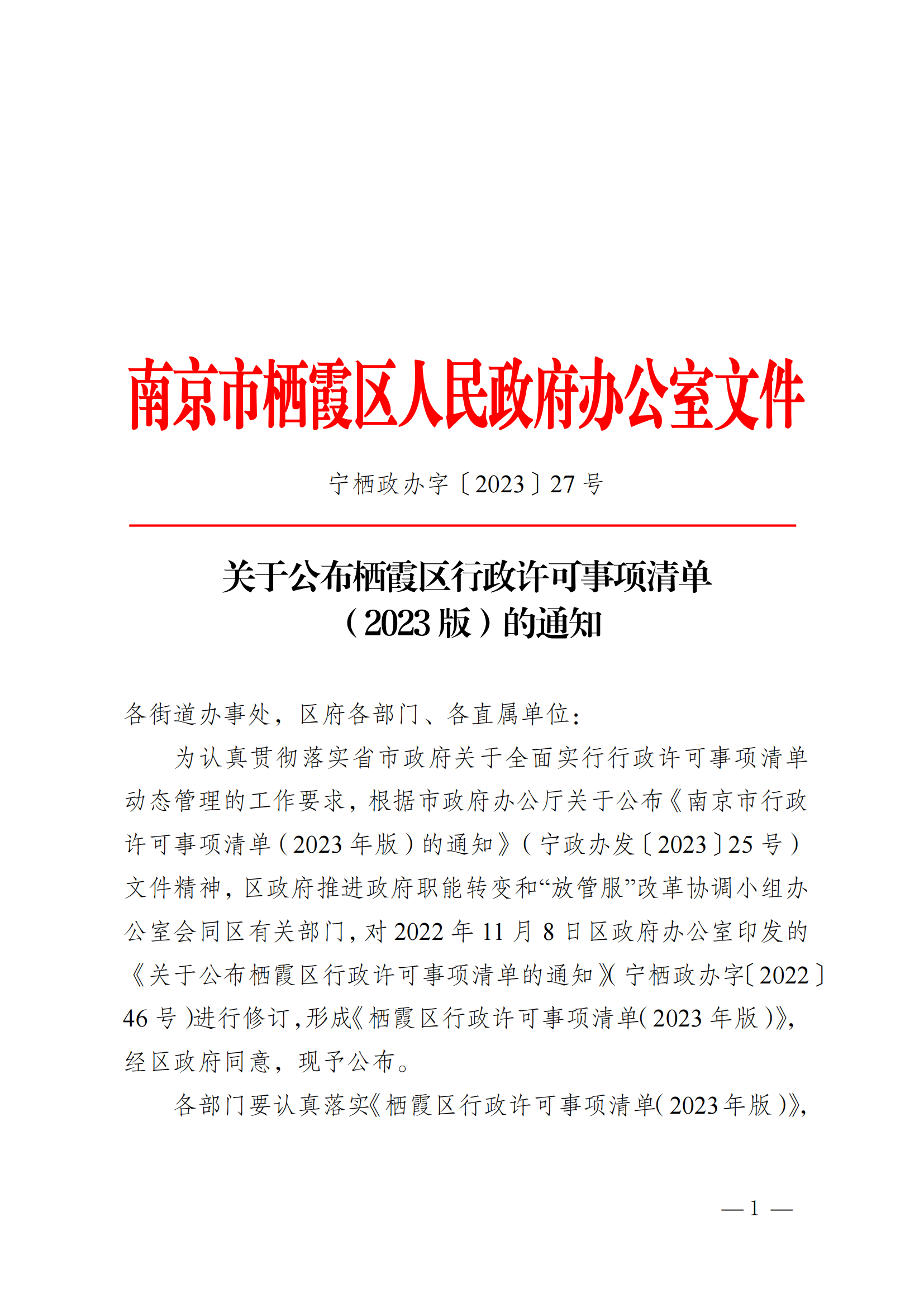 寧棲政辦字〔2023〕27號 關于公布棲霞區行政許可事項清單(2023版)的通知