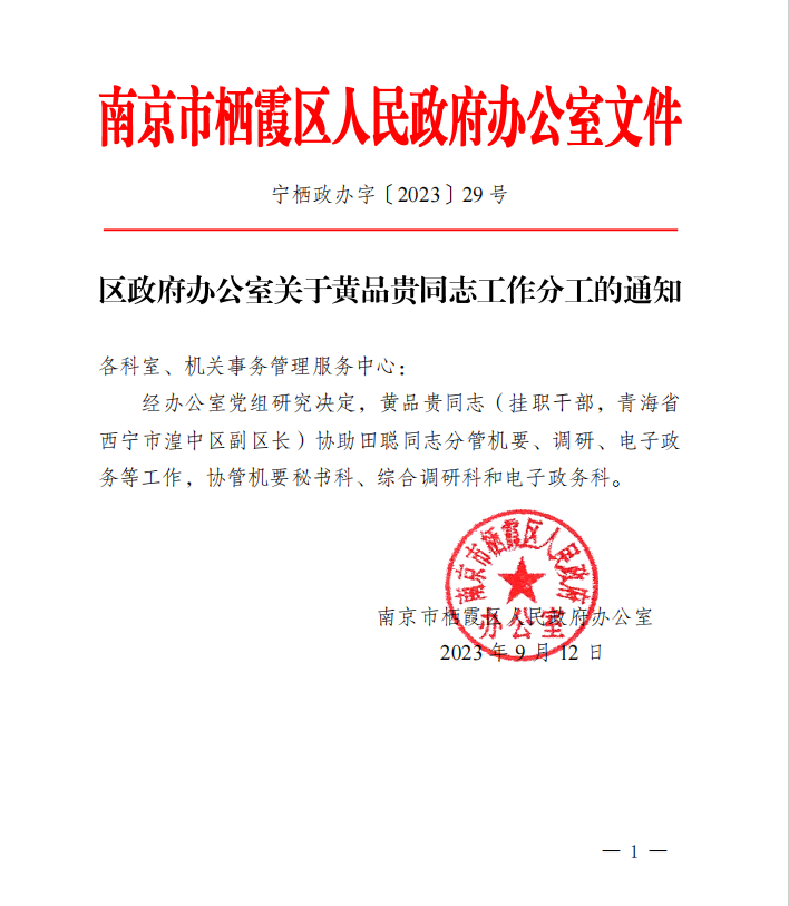 信息名稱:    關于黃品貴同志工作分工的通知