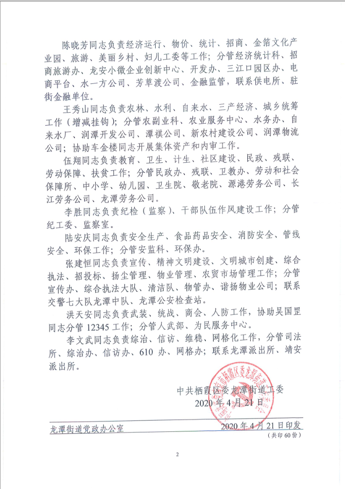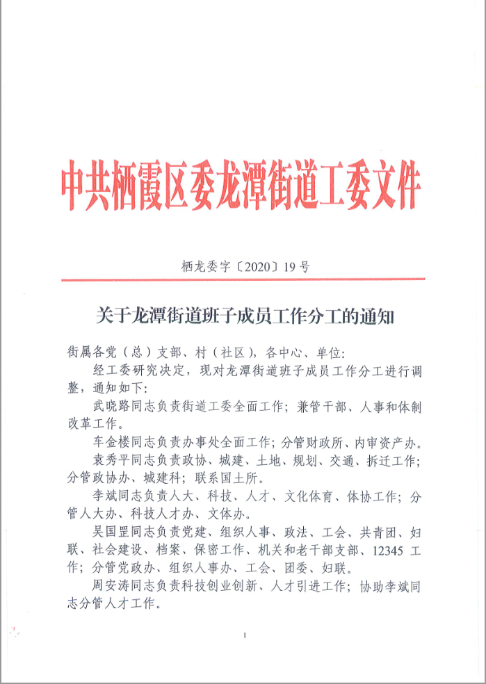 信息名稱:    關于龍潭街道班子成員工作分工的通知
