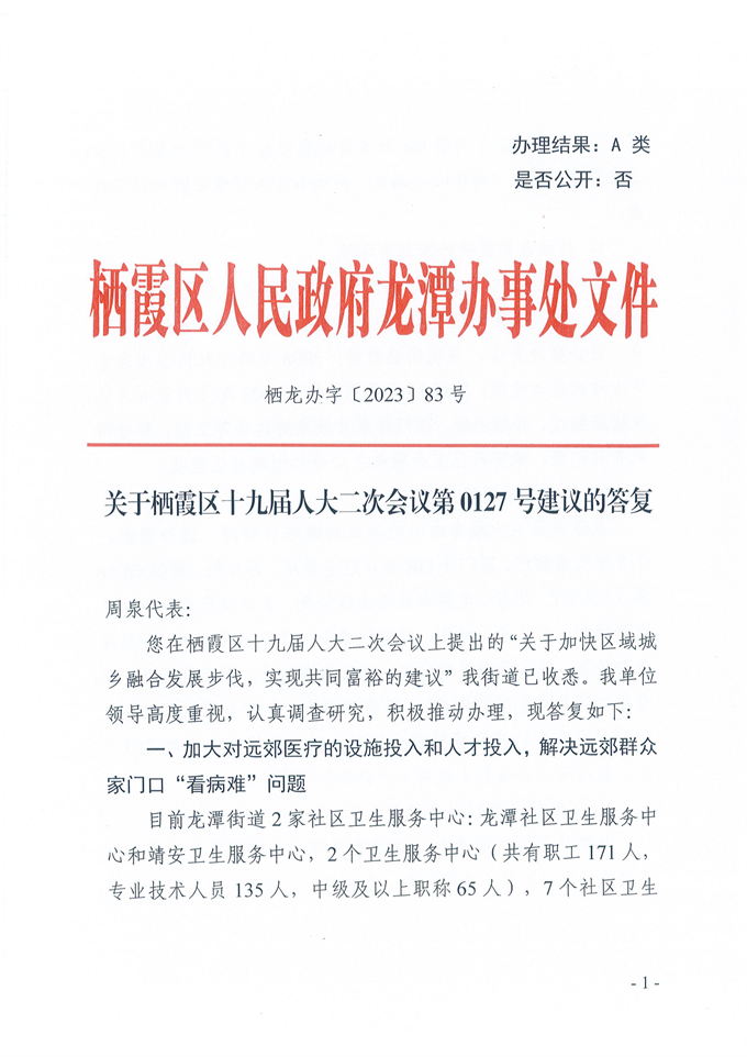 棲龍辦字[2023]83號關于棲霞區十九屆人大二次會議第0127號建議的答復
