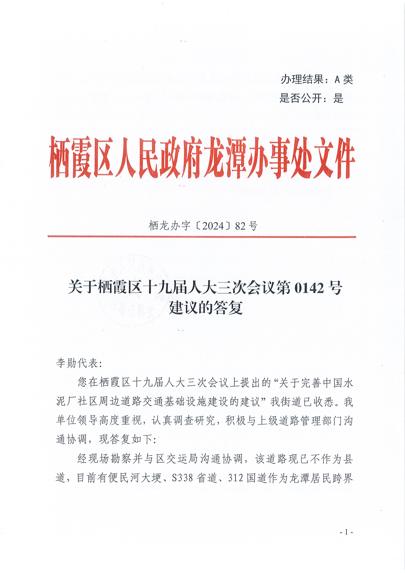 信息名稱:    棲龍辦字[2024]82號關于棲霞區十九屆人大三次會議第0142號建議的答復