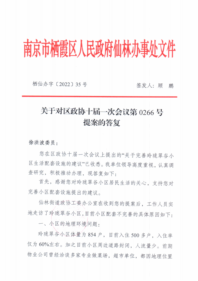 關于對區政協十屆一次會議第0266號提案的答復