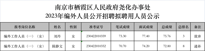 南京市棲霞區人民政府堯化辦事處2023年編外人員公開招聘擬聘用遞補人員公示