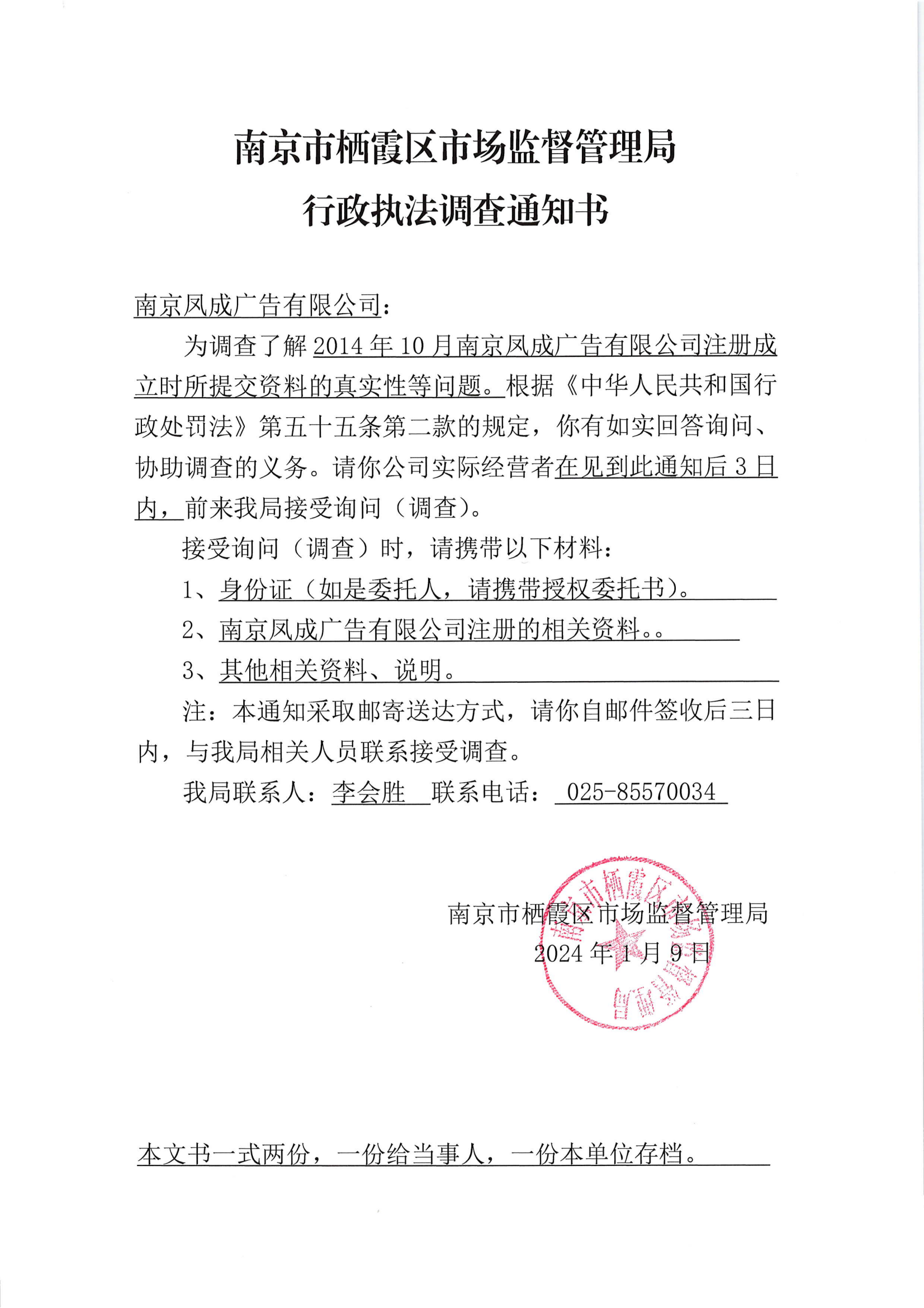 南京市棲霞區(qū)市場監(jiān)督管理局行政執(zhí)法調(diào)查通知書