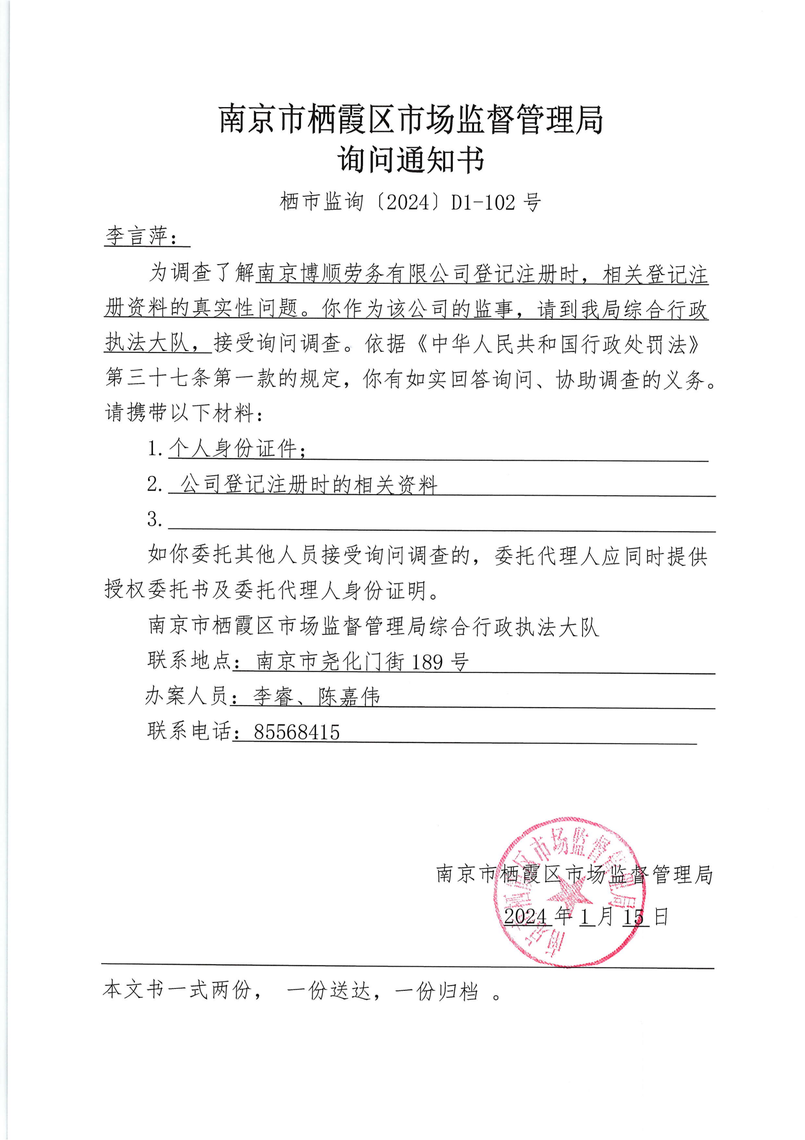 南京市棲霞區市場監督管理局詢問通知書