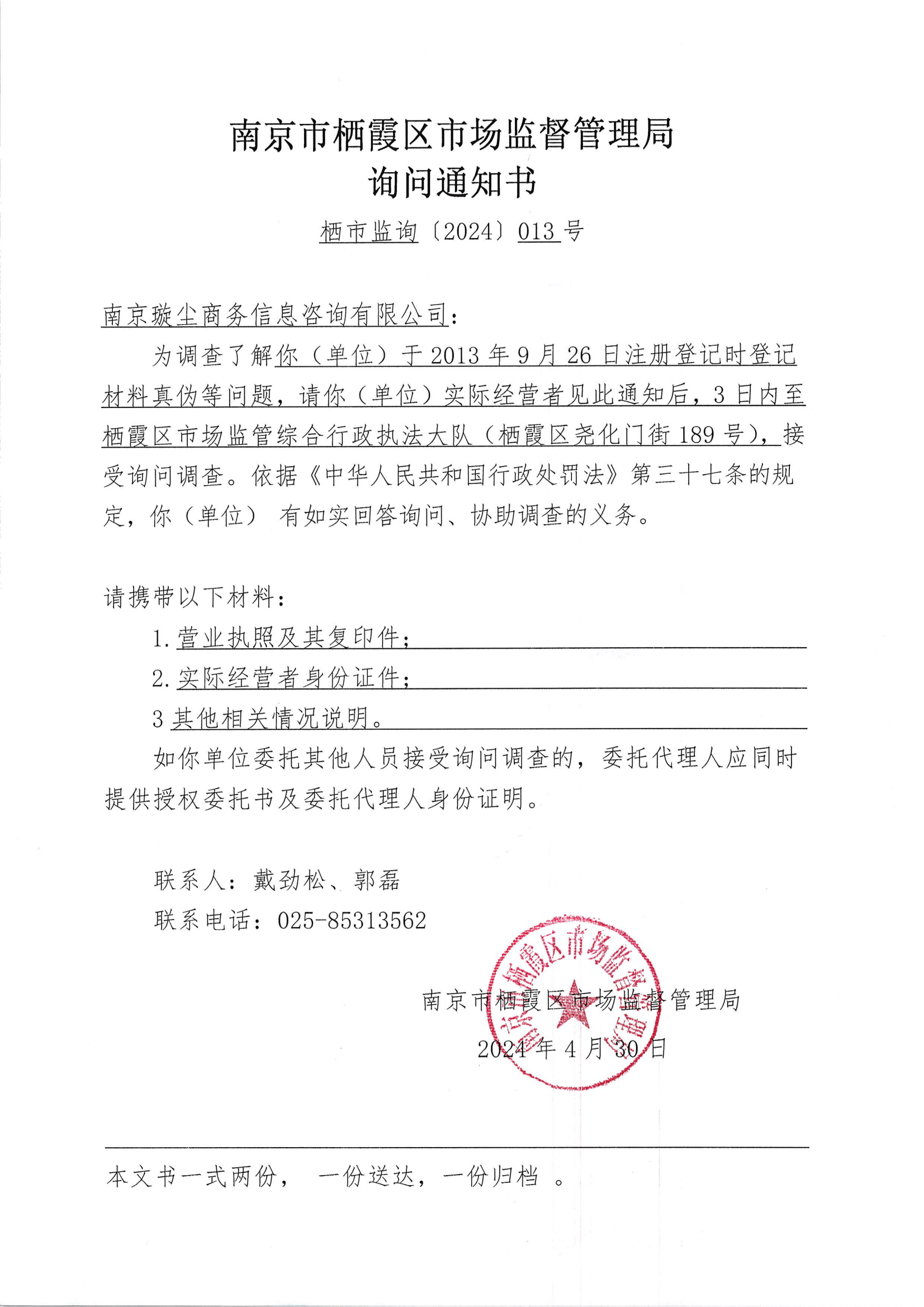 信息名稱:    南京市棲霞區(qū)市場監(jiān)督管理局詢問通知書