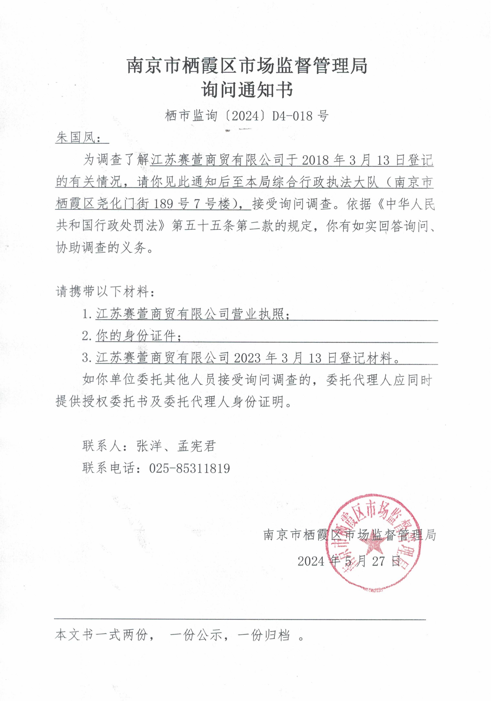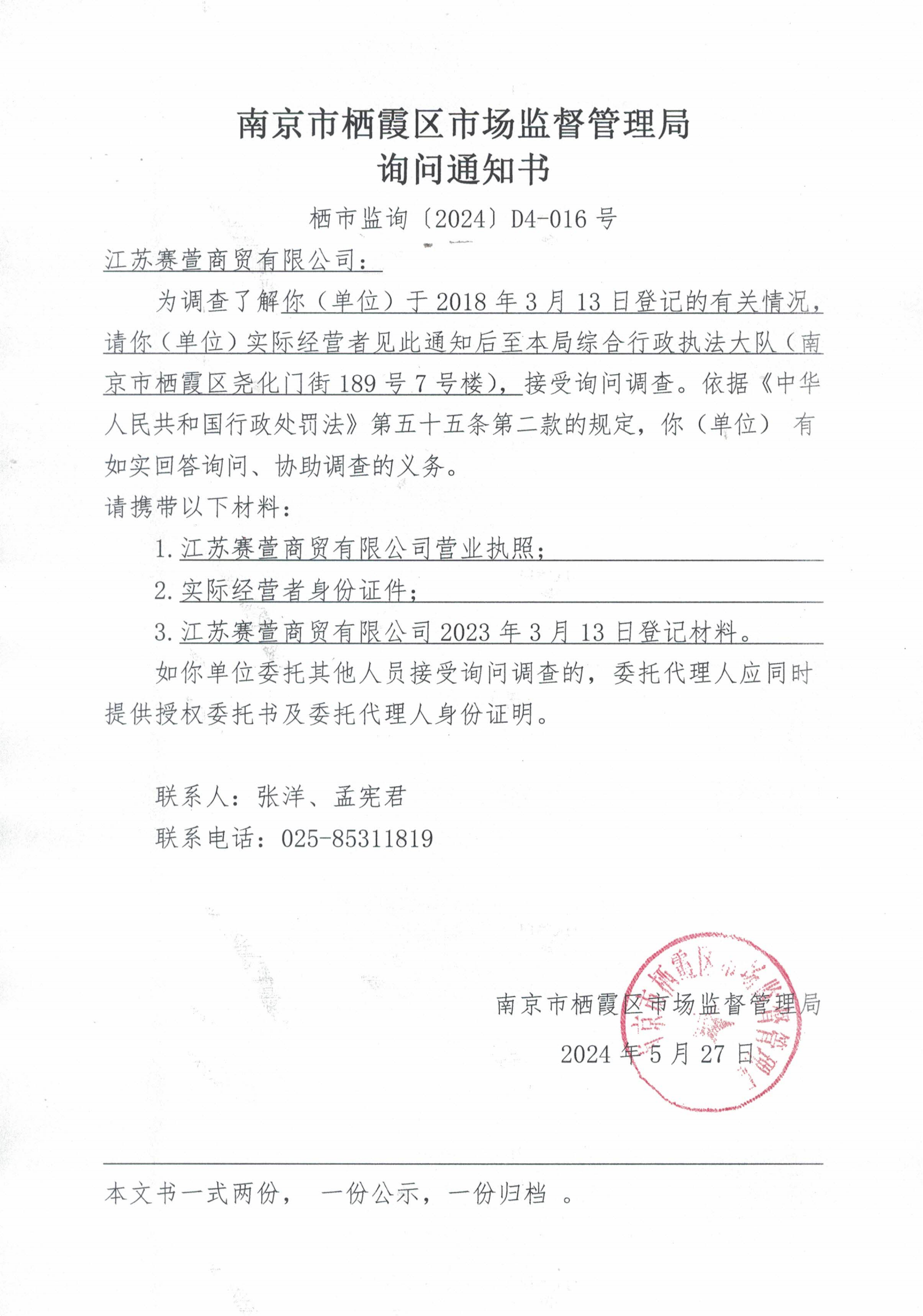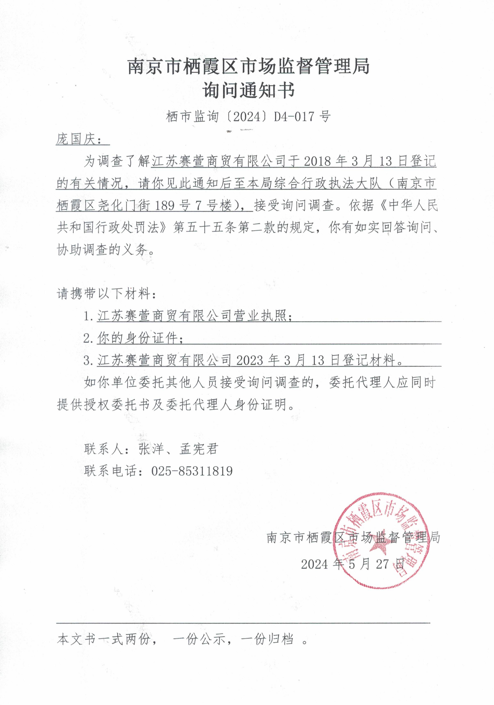 信息名稱:    南京市棲霞區市場監督管理局詢問通知書