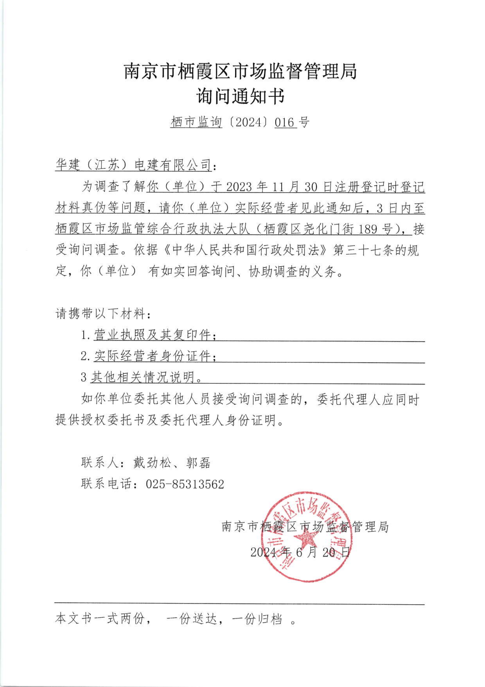 南京市棲霞區(qū)市場監(jiān)督管理局詢問通知書(南京華建(江蘇)電建有限公司)