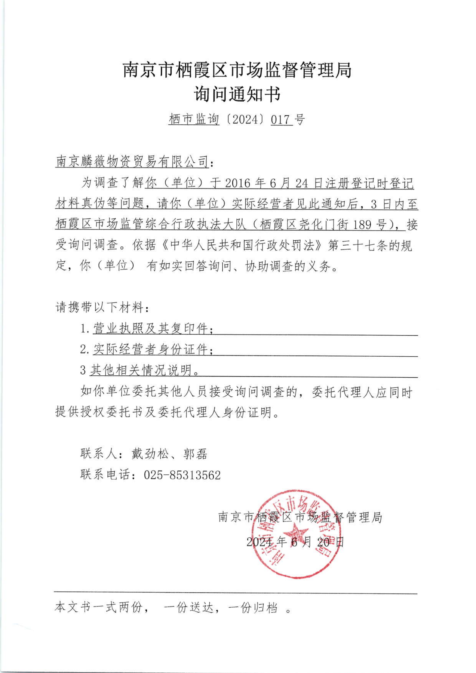 信息名稱:    南京市棲霞區市場監督管理局詢問通知書(南京麒薇物資貿易有限公司)