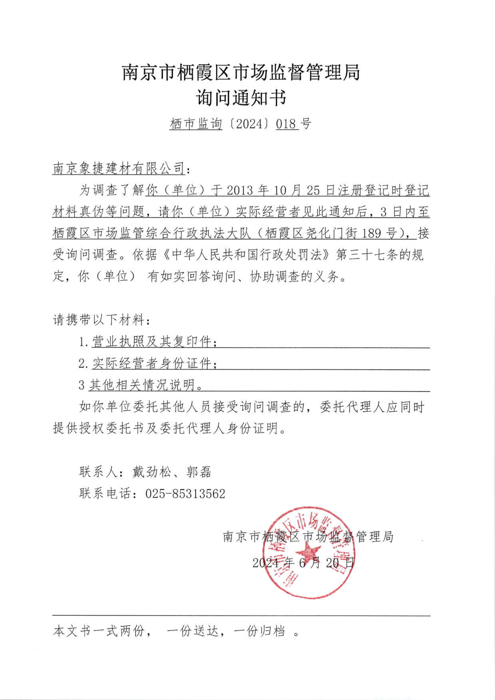 南京市棲霞區(qū)市場(chǎng)監(jiān)督管理局詢問(wèn)通知書(南京象捷建材有限公司)