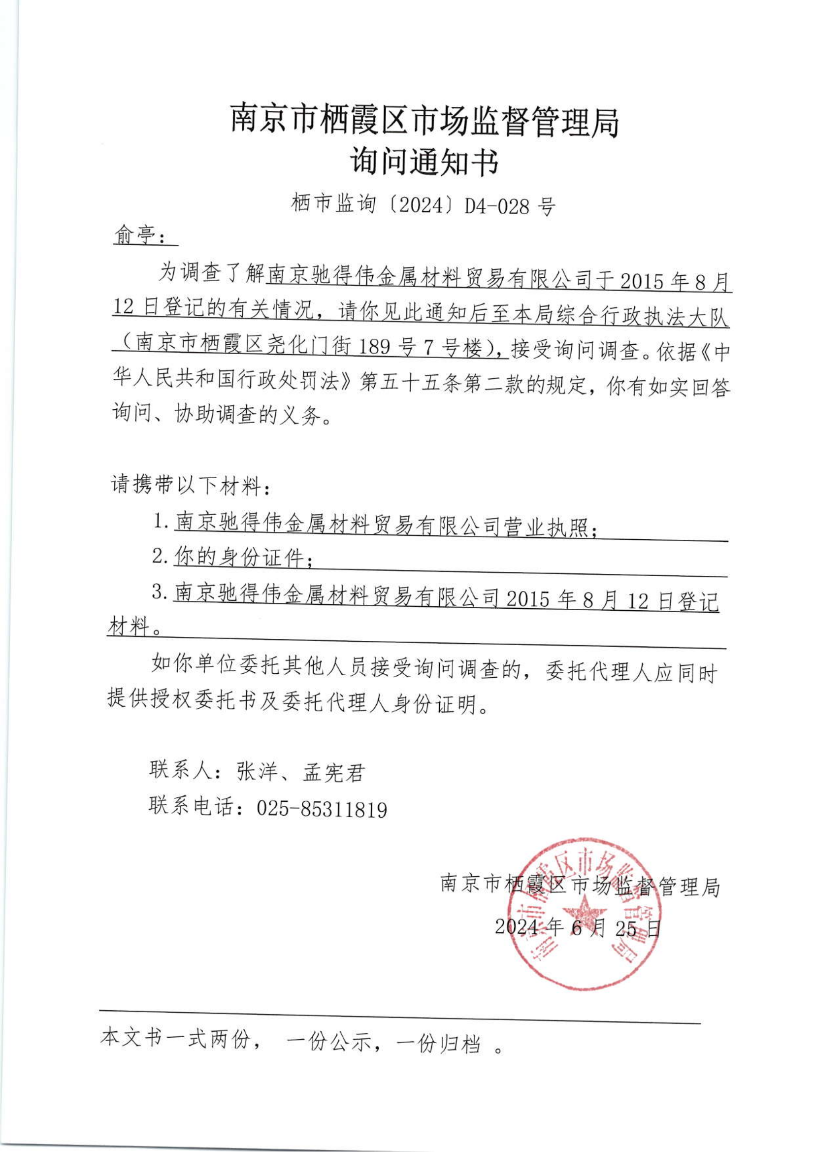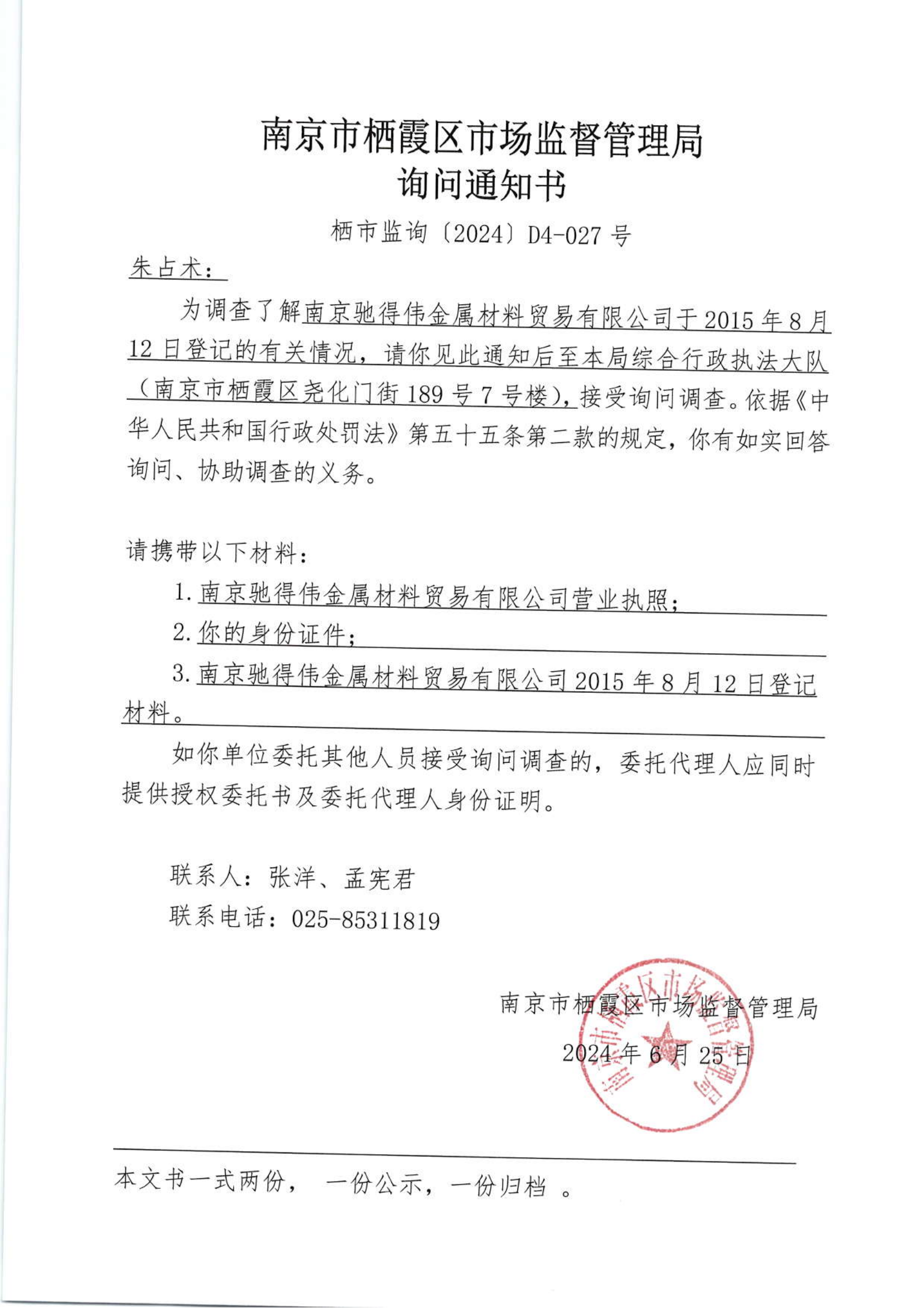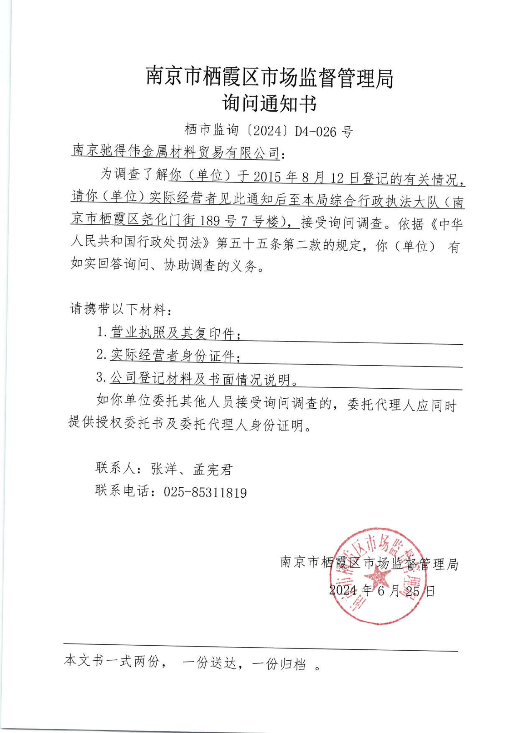 南京市棲霞區市場監督管理局詢問通知書(南京馳得偉金屬材料貿易有限公司)